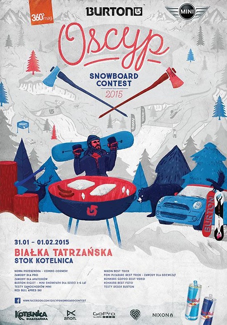 Zanim będziemy mogli dokładnie poznać przygotowane na 31 stycznia i 1 lutego rozrywki, główni sponsorzy (Burton i Mini) zorganizowali konkurs dla osób uzdolnionych artystycznie. MINI x Burton BoardDesignContest jest okazją do zdobycia deski Burtona z własnym projektem graficznym. Dodatkowo, zwycięzca będzie miał okazję skorzystać z przejazdu samochodem MINI podczas trwania festiwalu. Do 15 stycznia można przesyłać prace na konkurs@360mag.pl. Szablon deski w formacie PDF jest dostępny na oficjalnym fanpage’u imprezy: http://www.facebook.com/oscypsnowboardcontest